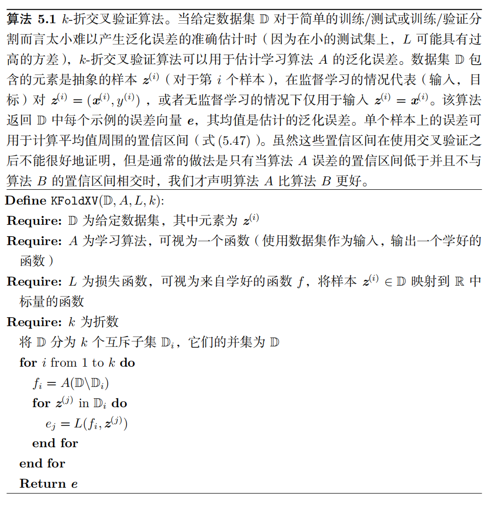 k- 折交叉验证过程,如算法 5.1 所示,将数据集分成 k 个不重合的子集。测试误差可以估计为 k 次计算后的平均测试误差。在第 i 次测试时,数据的第 i 个子集用于测试集,其他的数据用于训练集。带来的一个问题是不存在平均误差方差的无偏估计 (Bengio and Grandvalet, 2004) ,但是我们通常会使用近似来解决。