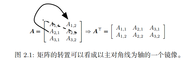 转置(transpose ): 是矩阵的重要操作之一。矩阵的转置是以对角线为轴的镜像,这条从左上角到右下角的对角线被称为主对角线 (main diagonal )。