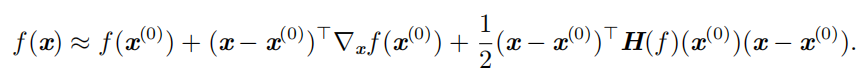 我们可以使用 Hessian 矩阵的信息来指导搜索,以解决这个问题。其中最简单的方法是 牛顿法 ( Newton's method )。牛顿法基于一个二阶泰勒展开来近似 x (0) 附近的 f ( x ) :