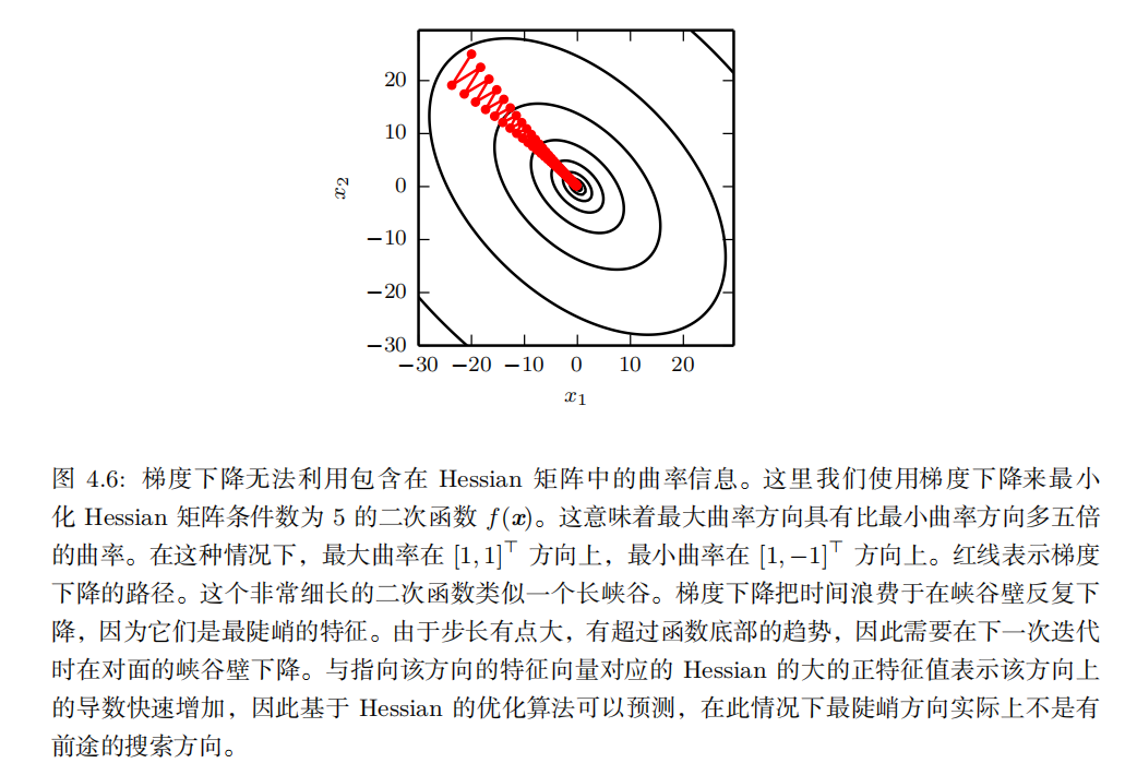 梯度向量指向上坡,负梯度向量指向下坡。我们在负梯度方向上移动可以减小 f 。这被称为 最速下降法 (method of steepest descent) 或 梯度下降 ( gradient descent )。