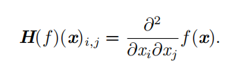 当我们的函数具有多维输入时,二阶导数也有很多。我们可以将这些导数合并成一个矩阵,称为 Hessian矩阵。Hessian 矩阵 H ( f )( x ) 定义为