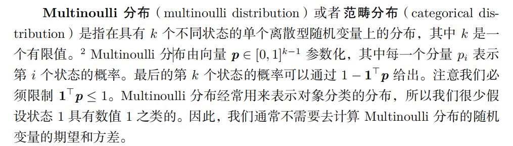 | Multinoulli 分布 ( multinoulli distribution ) 或者 范畴分布 ( categorical distribution) |