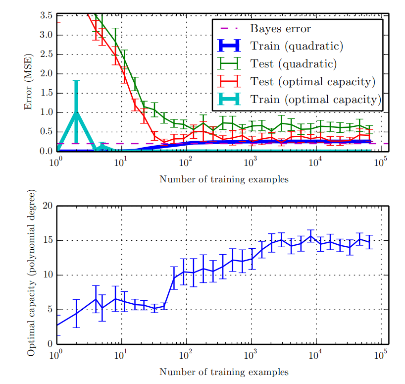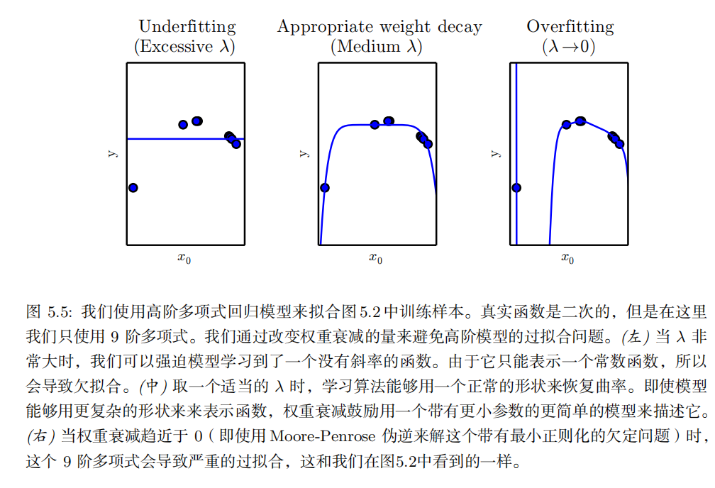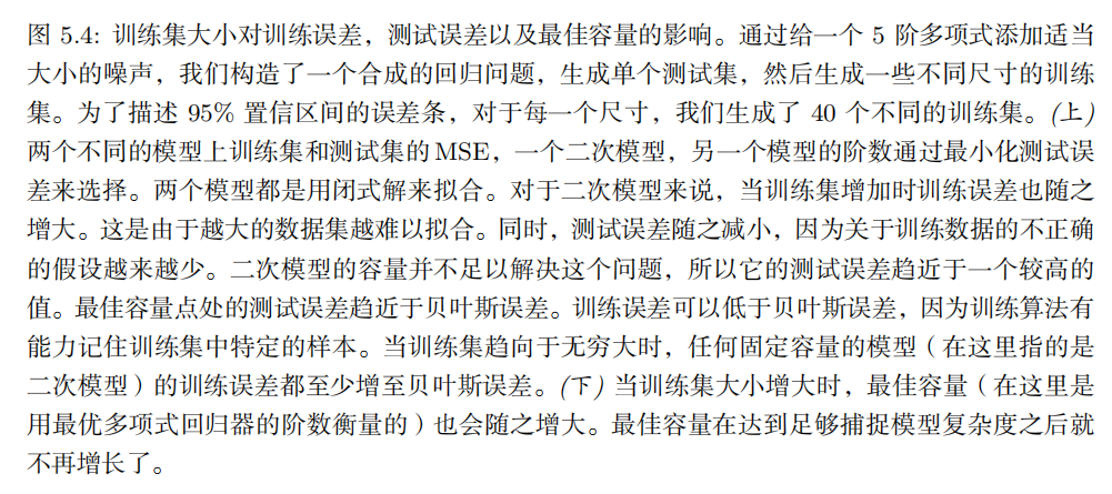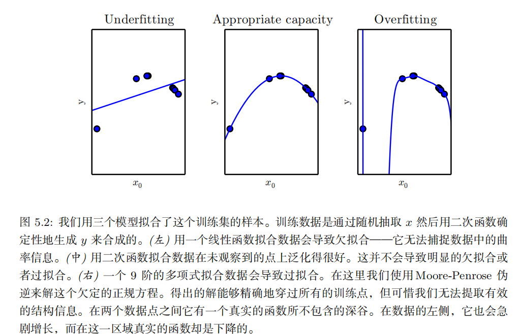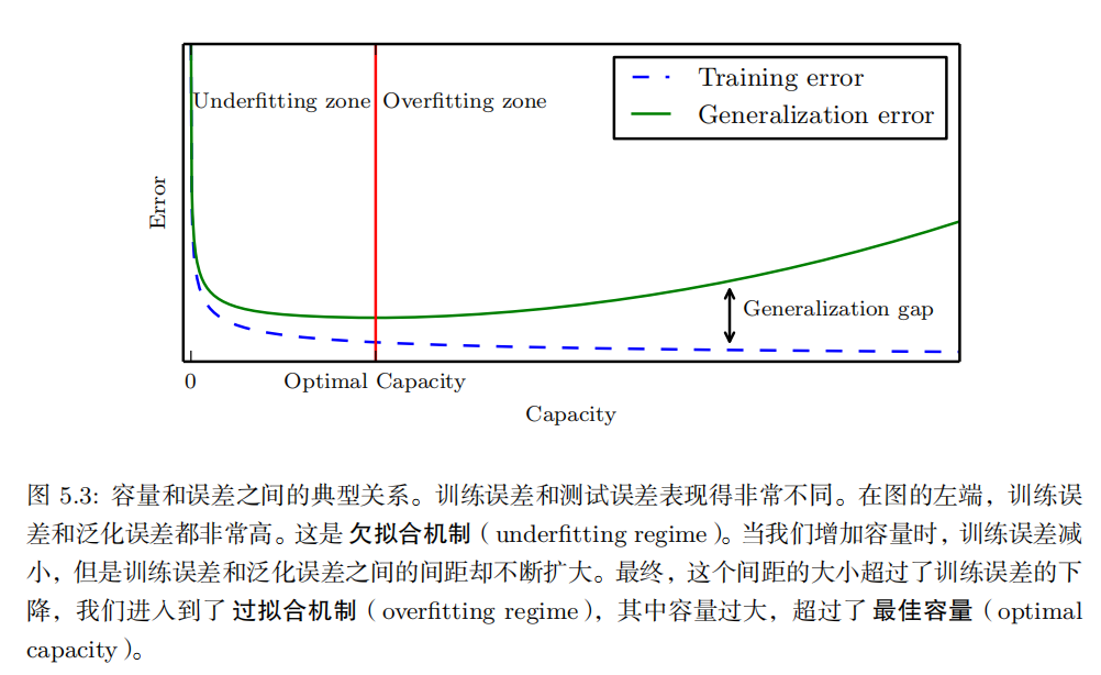 这两个因素对应机器学习的两个主要挑战: 欠拟合 ( underfitting )和 过拟合(overfitting )。欠拟合是指模型不能在训练集上获得足够低的误差。而过拟合是指训练误差和和测试误差之间的差距太大。