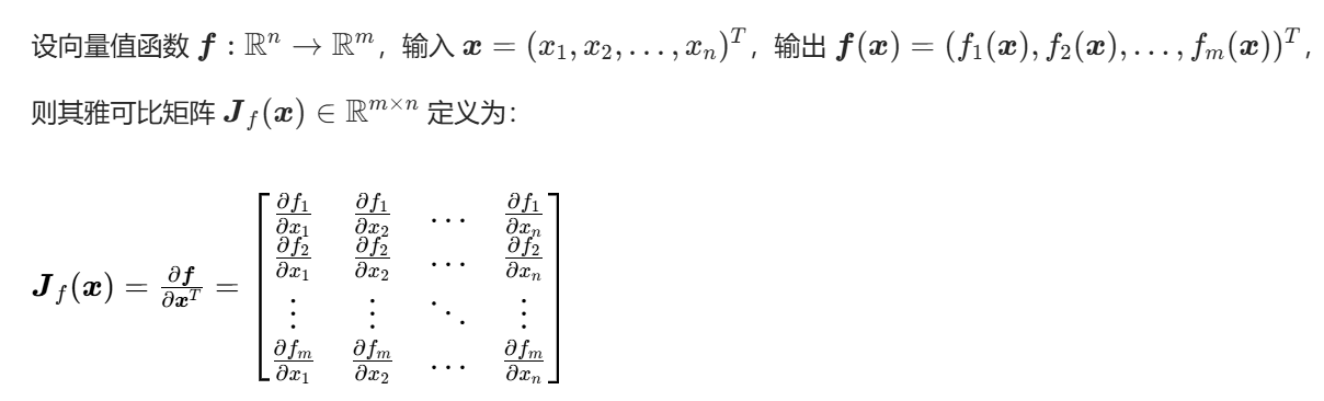 雅可比 :向量值函数的一阶变化率,m×n矩阵,核心做局部线性近似,是反向传播、EKF 滤波的基础;