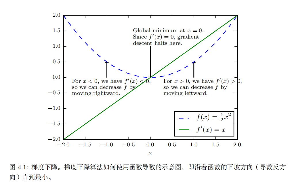 因此我们可以将 x 往导数的反方向移动一小步来减小 f ( x ) 。这种技术被称为 梯度下降(gradient descent )