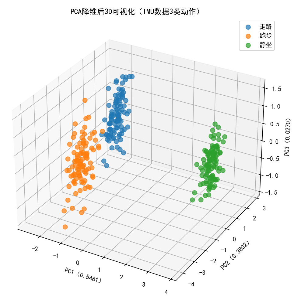 # 生成3类高维数据(模拟3种动作的IMU数据:走路、跑步、静坐)
