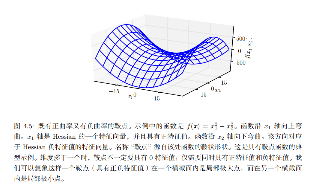 当 f ′ ( x ) = 0 ,导数无法提供往哪个方向移动的信息。 f ′ ( x ) = 0 的点称为 临界点( critical point )或 驻点 ( stationary point )。一个 局部极小点 ( local minimum )意味着这个点的 f ( x ) 小于所有邻近点,因此不可能通过移动无穷小的步长来减小 f ( x ) 。一个 局部极大点 ( local maximum )意味着这个点的 f ( x ) 大于所有邻近点,因此不可能通过移动无穷小的步长来增大 f ( x )。有些临界点既不是最小点也不是最大点。这些点被称为 鞍点 ( saddle point )。