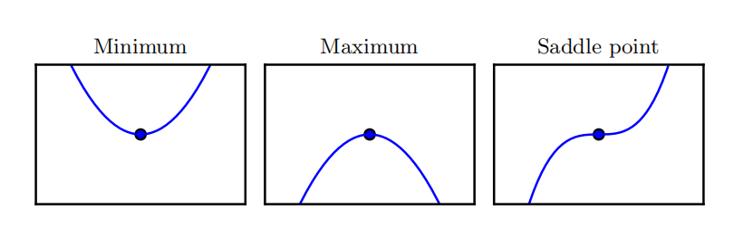 二阶导数 还可以被用于确定一个临界点是否是局部极大点、局部极小点或鞍点,这就是所谓的 二阶导数测试( second derivative test)。例如,二阶导<0,是局部极大值点,>0是局部极小值点。不幸的是,当 f ′′ ( x ) = 0 时测试是不确定的。在这种情况下, x可以是一个鞍点或平坦区域的一部分。