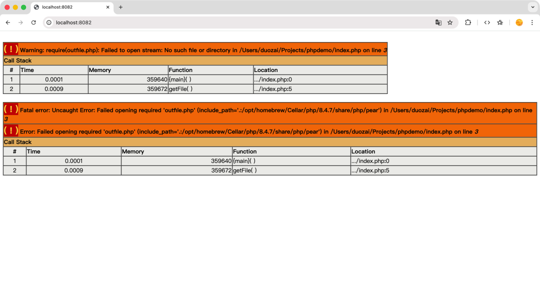Xdebug 会将错误信息变成彩色表格形式,并且将错误定位到具体的函数。