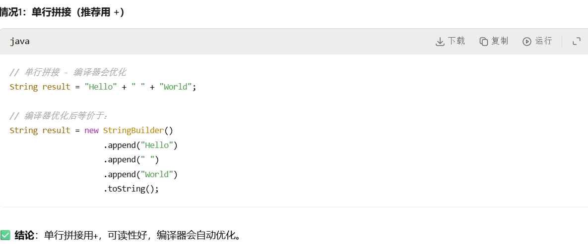 少量、单行拼接 :用+,因为编译器会自动优化为StringBuilder,代码更简洁。