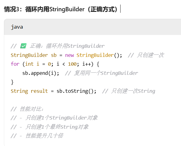 循环内或大量拼接 :必须用StringBuilder,并且要在循环外创建。