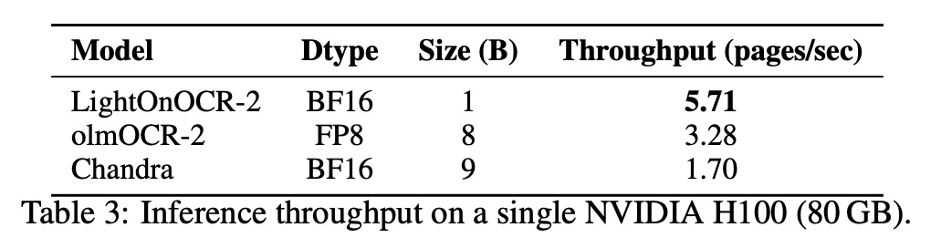 在单张NVIDIA H100 GPU上,LightOnOCR-2的推理速度达到5.71页/秒: