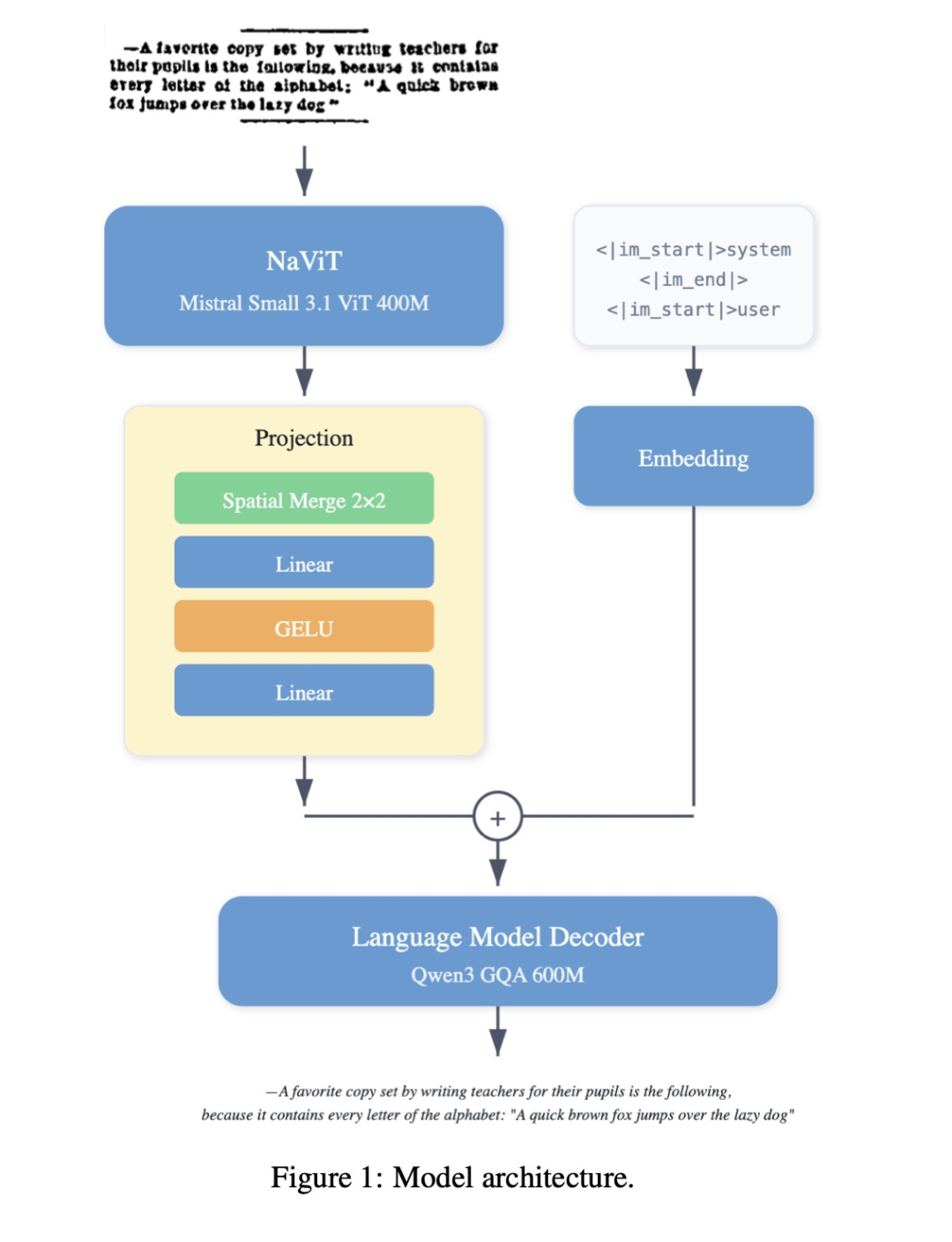 **视觉编码器:**基于Mistral-Small-3.1的预训练权重,采用原生支持高分辨率的ViT架构,能精准捕捉文档中的微小排版细节