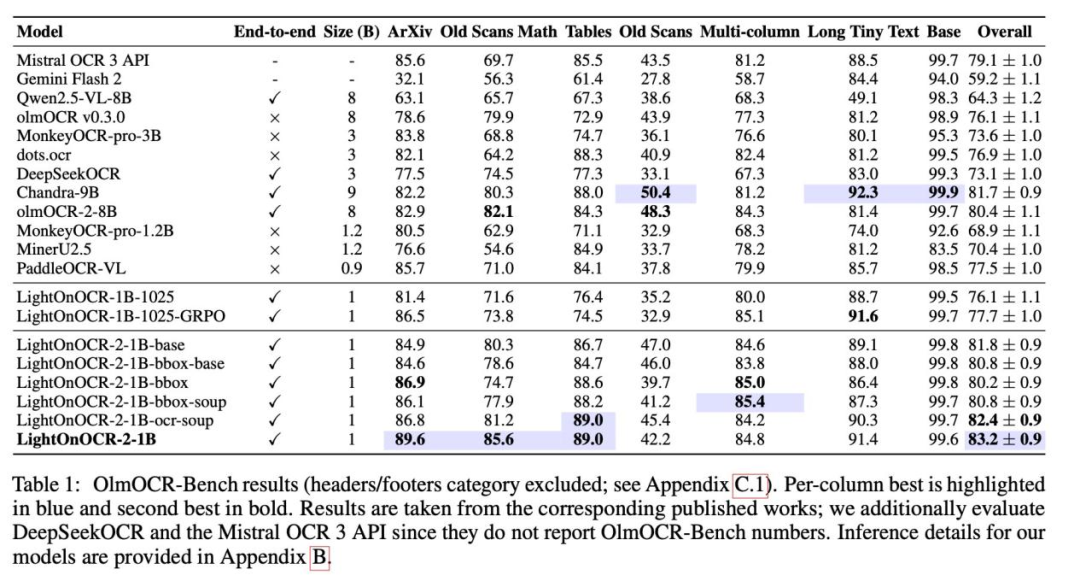 在OlmOCR-Bench基准测试中,LightOnOCR-2-1B取得了83.2分的优异成绩,超越了此前最强的9B参数模型Chandra(81.7分),成为新的榜单冠军。