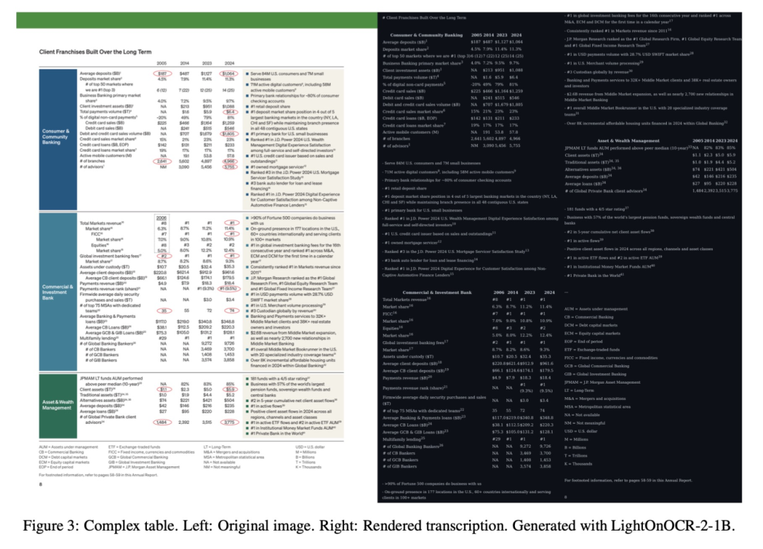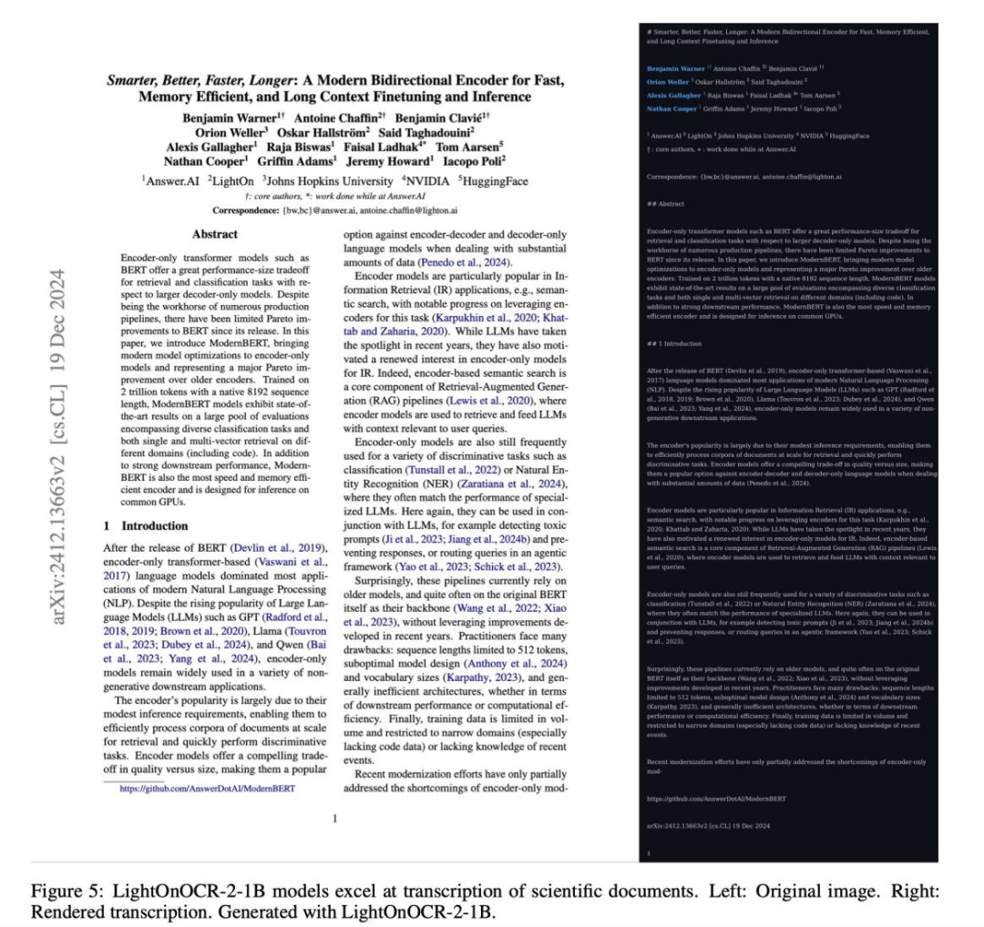 LightOnOCR-2代表了一种全新的技术范式------端到端文档理解。这种模型像一个"全能专家",直接从原始文档图像输入,一步到位生成结构清晰、顺序正确的文本输出。