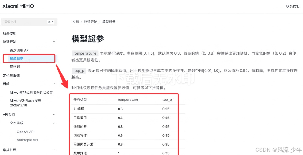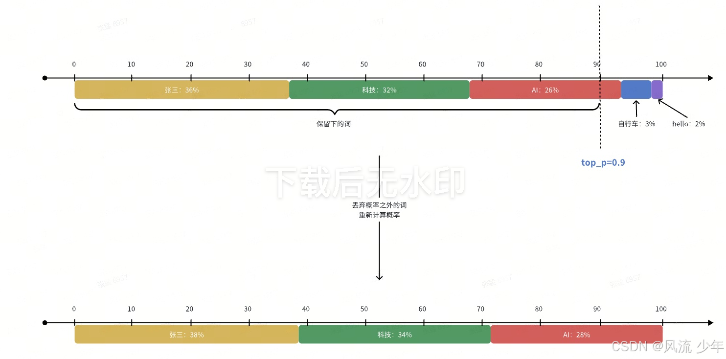 防止模型去选择长尾词,需要一个保安,将这些离谱的选项都拦在门外------Top-p(Top Cumulative Probability):最高累加概率;其中p就是指的一个概率阈值。