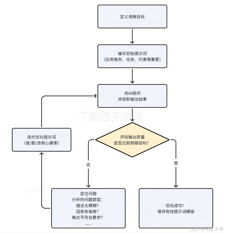 提示词工程往往不是一蹴而就的,而是一个"编写 - 测试 - 分析 - 迭代"的循环过程。