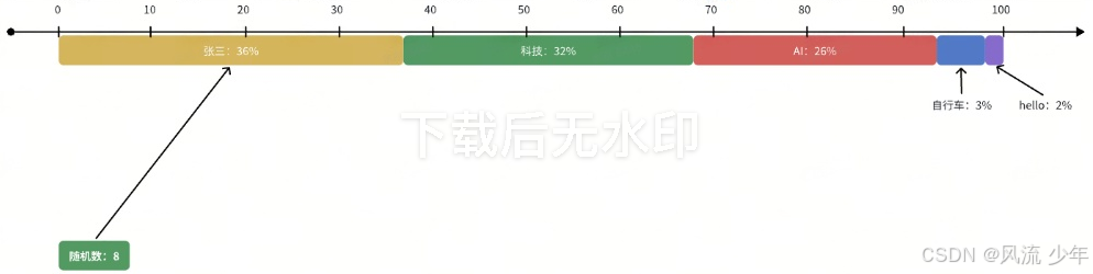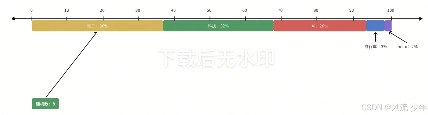 在加权采样时,上面根据每一个词的分数,给它们分配了对等的区间,然后生成一个随机数,来确认预测词。