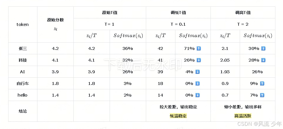 Softmax函数完整版本:其中T就是"Temperature",只不过最开始设置成了 T=1 ;T的作用:改变不同词的概率差距
