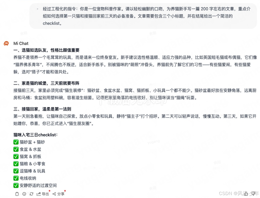 使用提示词工程优化后: - 经过工程化的指令:你是一位宠物科普作家。请以轻松幽默的口吻,为养猫新手写一篇 200 字左右的文章,重点介绍如何选择第一只猫和接猫回家前三天的必备准备。文章需要包含三个小标题,并在结尾给出一个简洁的 checklist。