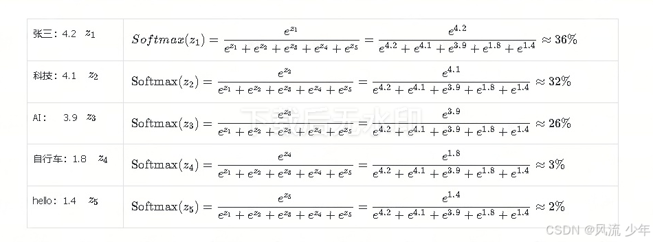 S o f t m a x ( z i ) = e z i ∑ j = 1 K e z j = e z i e z 1 + e z 2 + e z 3 + e z 4 + e z 5 Softmax(z_i) = \frac{e^{z_i}}{\sum_{j=1}^K e^{z_j}} = \frac{e^{z_i}}{e^{z_1} + e^{z_2} + e^{z_3} + e^{z_4} + e^{z_5}} Softmax(zi)=∑j=1Kezjezi=ez1+ez2+ez3+ez4+ez5ezi
