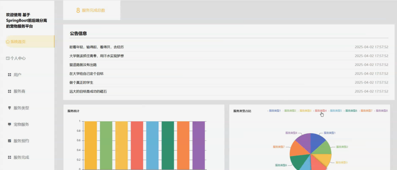 随着人们生活水平提升,宠物成为家庭重要成员,宠物服务需求日益多样化、专业化,涵盖日常护理、医疗保健、寄养、训练等多个领域。传统宠物服务模式存在信息不对称、服务效率低下等问题,难以满足现代用户对便捷性、专业性的需求。在此背景下,基于前后端分离架构的宠物服务平台应运而生,依托现代信息技术整合宠物服务各环节,为用户与服务商提供一站式解决方案,规范宠物服务市场,实现双方双赢。