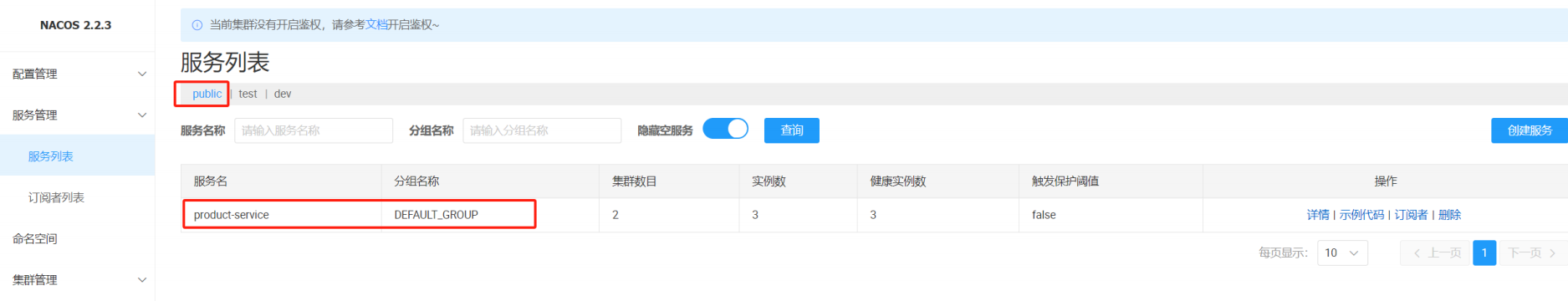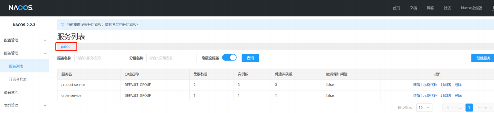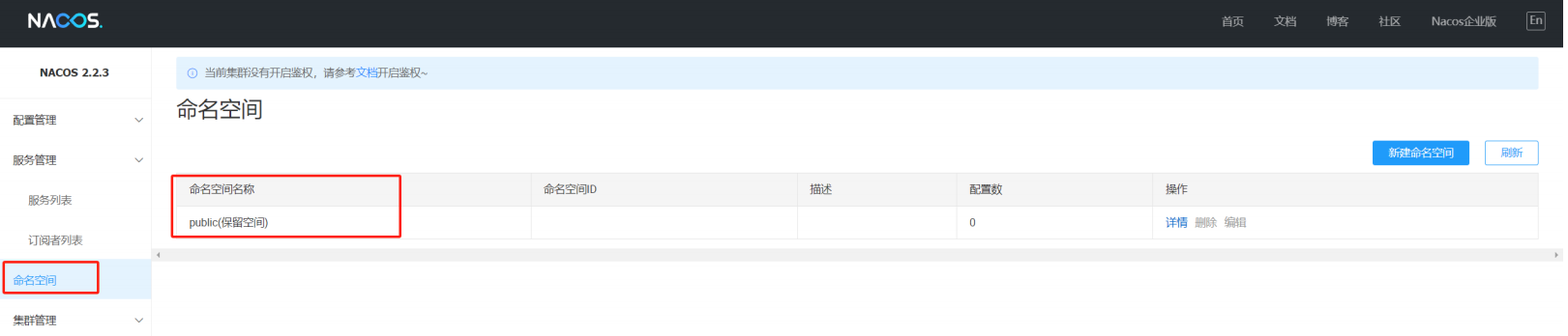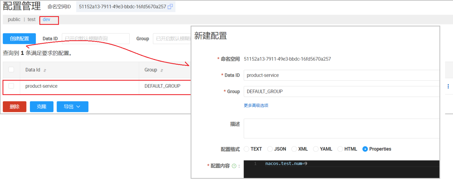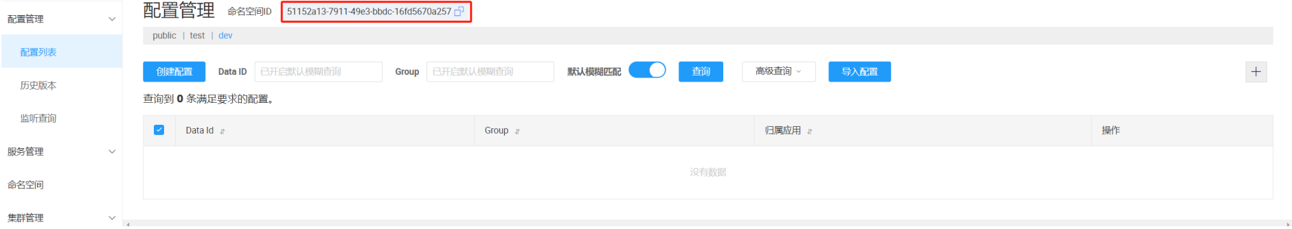 注意: 配置管理的命名空间和服务列表的命名空间是隔离的, 两个是分别设置的. 默认是public也就是服务管理命名空间配置 ≠ 配置管理的命名空间
