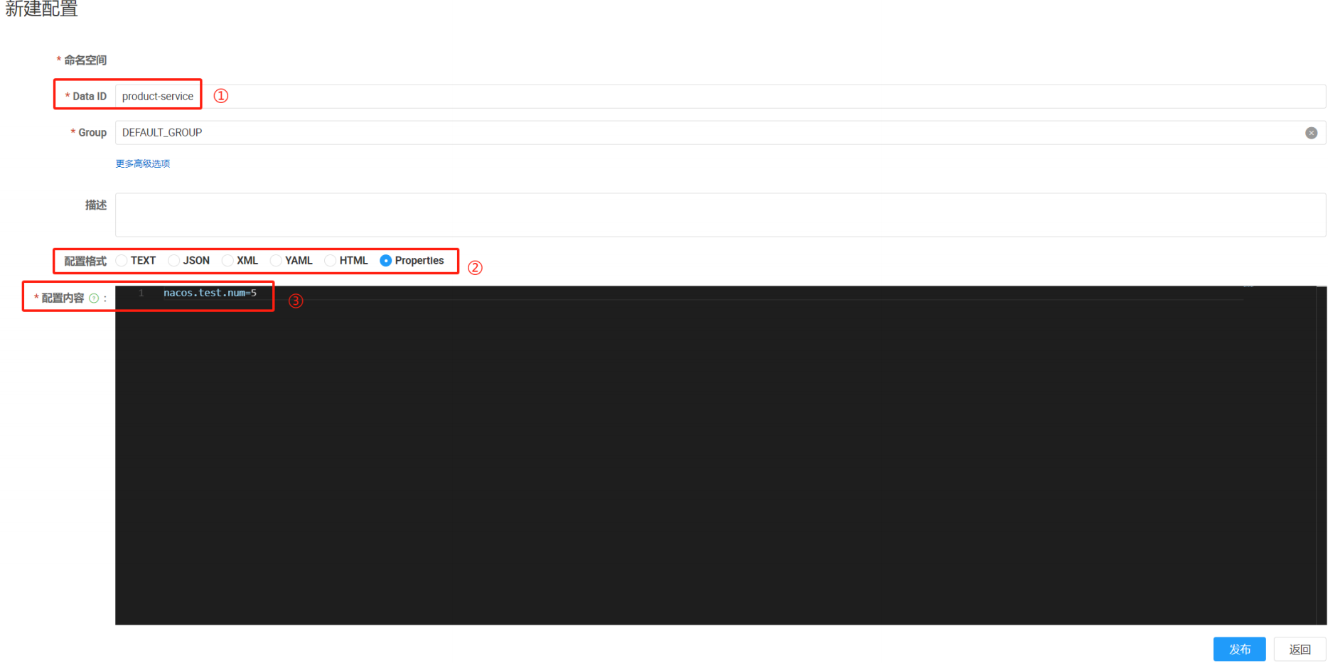 在Nacos控制台添加配置项