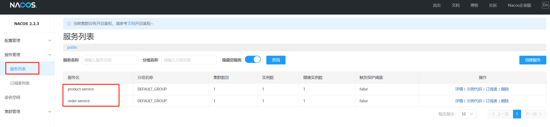 Nacos配置管理的命名空间和服务列表的命名空间是分别设置的. 默认是public