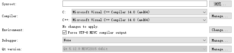 我们打开QtCreator的Kits设置界面,选中Desktop 5.12.9 MSVC2015 64bit 套件,显示如下,由于早就安装过VS2015,QtCreator自动检索到了相应的编译器(何时其路径确为VS安装路径),但是Debugger并没有。