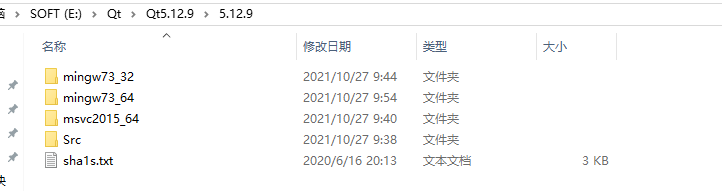 在主安装目录下,以版本号命名的目录就是框架目录。如我们安装Qt软件时,勾选了mingw32、mingw64,msvc2015_64、源码SRC,则安装完成后,宽假目录将是以下样子,
