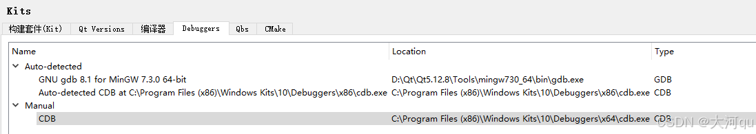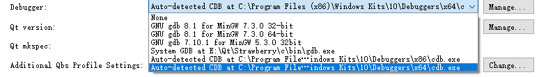 在一个安装或配置良好的系统找那个,则QtCreator的调试器或Kit配置界面应该是能自动检索到CDB调试器的。