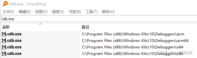 安装成功后,可以在C盘下搜索到4个cdb.exe位置,应该是与编译器类型有关,分别位于arm、arm64、x86、x64目录下,我们需要的应该是C:\Program Files (x86)\Windows Kits\10\Debuggers\x64目录下的这一个。
