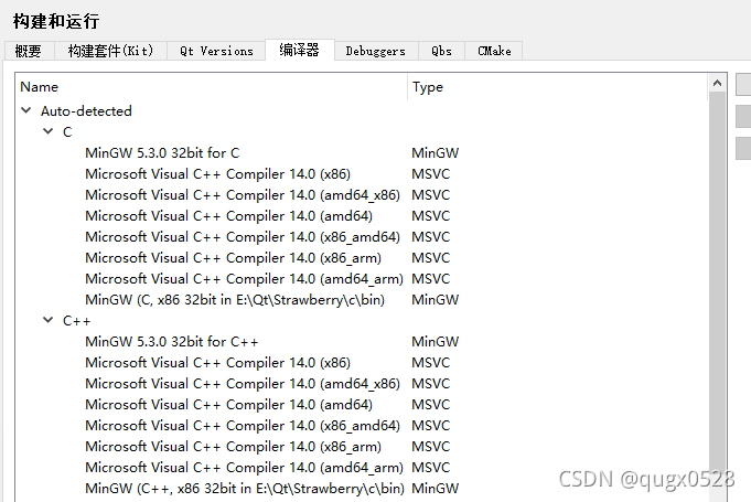 上述MSVC编译器的安装目录都指向VS的安装目录。上图是Microsoft Visual C++ Compiler 14.0(即 MSVC 2015)的不同 目标架构(Target Architecture)和平台组合。它们代表了同一个编译器在不同硬件架构下的变体,用于生成针对特定 CPU 架构的可执行文件。