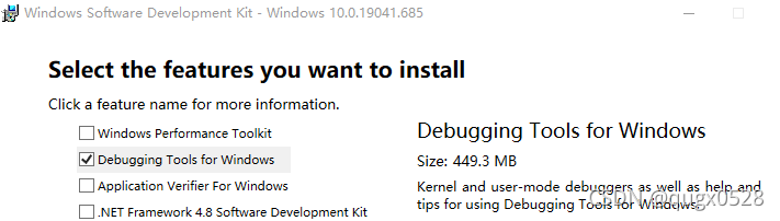 这与我们之前,独立安装 Windows SDK 其他版本的包时,其界面是一毛一样的。随VS2017安装的Windows SDK并没有安装CDB调试器,我们可以在上述界面的基础上继续操作,然后把CDB工具给安装上。如此操作,比独立去下载其他Windows SDK版本来安装使用,是更合适的,毋庸置疑,原配更好。同一个版本下CDB和调试库、运行库等是更和谐,更不容易出现调试问题的。