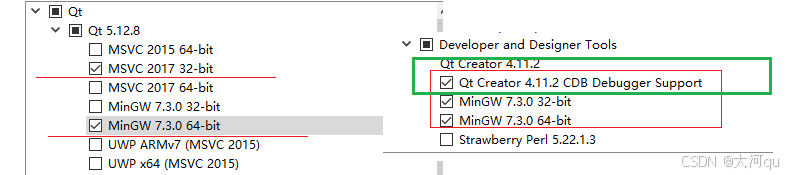 说来奇怪,Qt 5.12 版本我安装过N多次了,以前竟然没有留意到过有Qt Creator 4.11.2 CDB Debugger Support 这个东西。