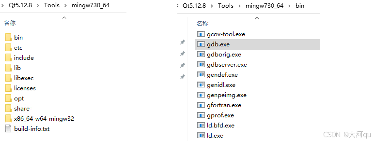 使用MingW编译和调试时,我们要从上图目录(安装Qt软件时,只要勾选了mingw32和mingw64就会从安装包解压出如上工具包,其中包含gcc、g++、gdb等)中选择相应的编译器和调试器。注意qmake不再这里哈。