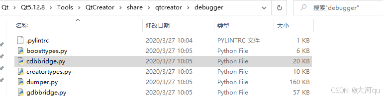 我原本期望着,勾选了上图绿色框中的Qt Creator 4.11.2 CDB Debugger Support 选项后,能像mingw那样,在安装目录Tools文件夹下能被创建出来一个类似mingw730_64名称的QtCreator CDB目录来,可惜没有,只能搜到一个 cdbbridge.py 脚本,