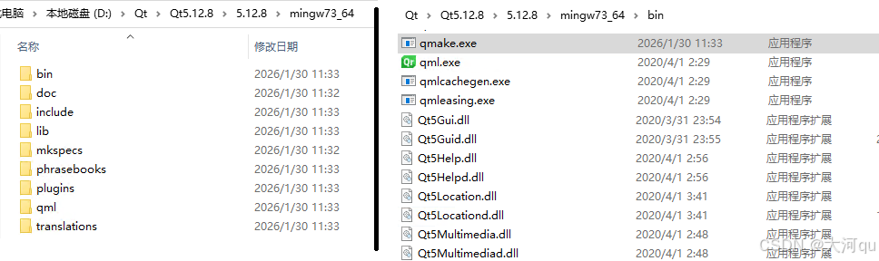 这些文件夹下,存储的是对应编译器编译出来的Qt框架动态库或可执行文件,像qmake.exe、assistant.exe、moc.exe、Qt5Cored.dll等依赖库。调试器、编译器等工具不在此处,它们存在与Tools工具目录。