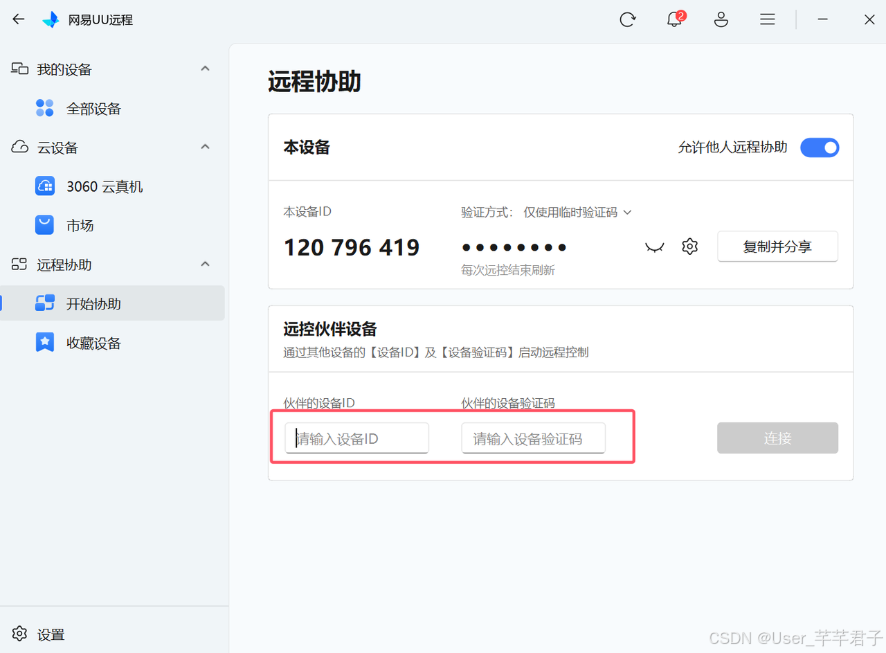 - 功能细节:被协助方无需注册登录,下载客户端即可获取设备ID与验证码。