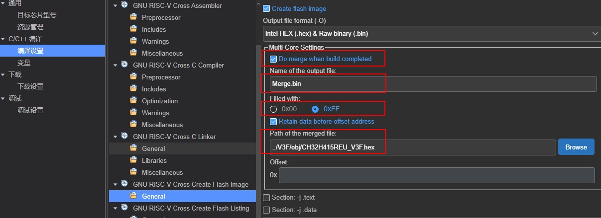 然后对V5F核工程进行编译。V5F核工程已默认设置了编译后对输出的可执行文件进行合并,合并相关设置如下图所示。可设置合并后文件名称,字节填充方式以及用于与V5F工程输出文件合并的文件。