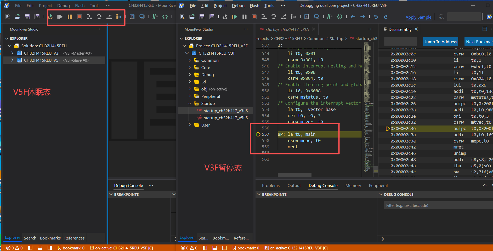 4.待调试流程启动完成后,一共会有两个窗口,分别包含V3F核工程和V5F核工程。其中V5F核处于休眠挂起,等待V3F核唤醒。