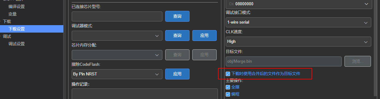 选择V5F工程,下载配置中已默认勾选"下载时使用合并后的文件作为目标文件"。
