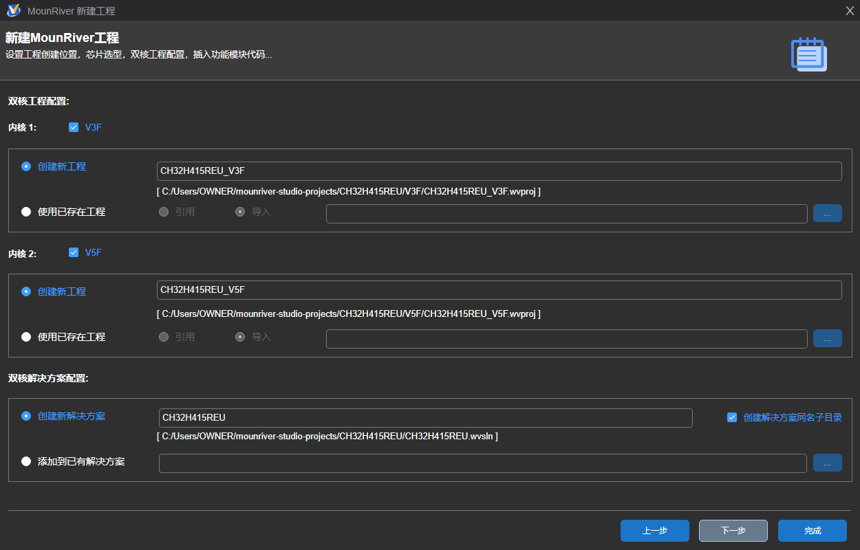 3.进行双核工程配置:可分别选择两个内核使用新建工程或导入已存在工程,并选择创建新双核解决方案或添加到已有解决方案。点击完成即可完成创建。