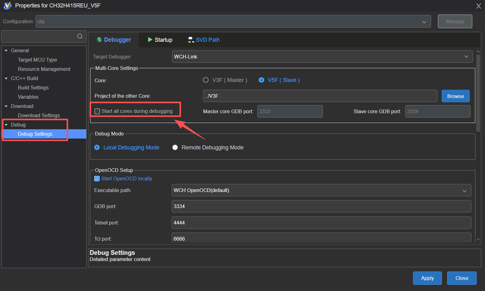 1.MRS2支持双核同时调试和每个核单独调试。默认调试时启动双核,如果只需要调试单核,可以右键工程选择Properties选项,在属性对话框中的选择Debug Settings->Debuger,取消勾选Start all cores during debugging即可。