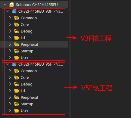 4.创建好的双核工程如图所示,包含V3F核工程和V5F核工程。