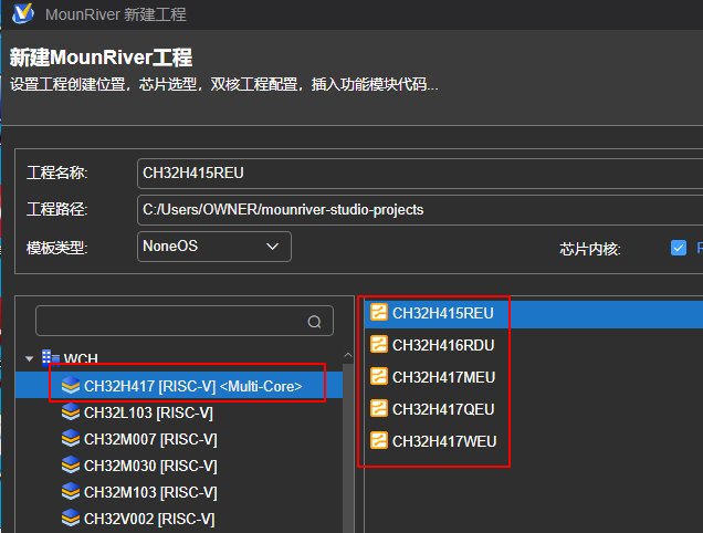 MRS2可以直接新建CH32H417双核项目,步骤如下: