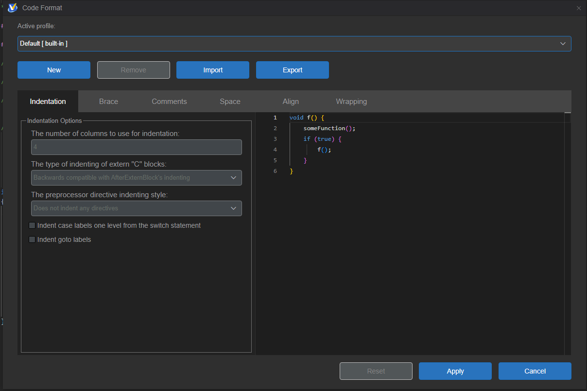 MRS2提供了代码格式化功能,帮助开发者轻松修正代码的缩进、换行以及重新排列注释,只需在菜单栏Edit->Code Format配置好自己的个性化格式化参数,可以选择内置格式模板,或点击New创建新的格式模板。点击Apply生效。