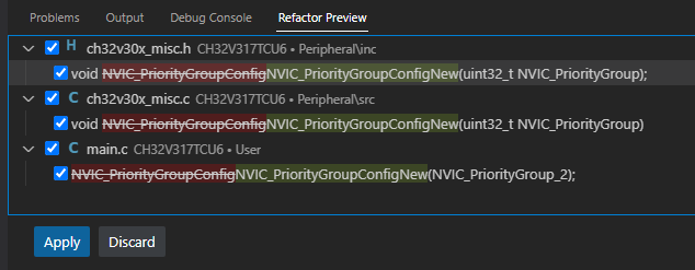除此之外,MRS还有重命名预览功能,在输入后按Shift+Enter,即可获得预览列表,所有即将被修改的符号都会清楚展示在列表中,更便于确认。点击Apply即可成功重命名,点击Discard也可轻松取消。