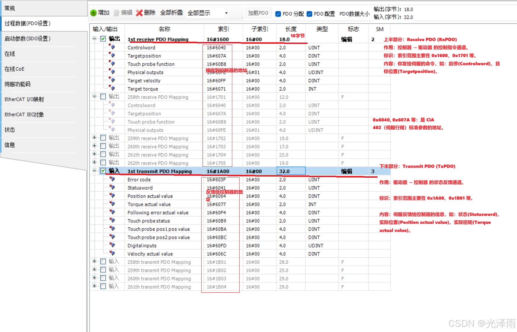"输出(字节): 18.0" :指从控制器输出 到驱动器的总数据量,即激活的接收PDO(